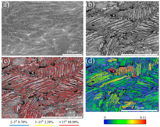 Figure 3d presents the Grain Orientation Spread (GOS) map, which quantifies the average angular deviation of crystallographic orientations within individual grains relative to neighboring grains. This map serves as a critical tool for distinguishing between recrystallized and deformed grains. In the GOS map, color gradients represent the intensity of lattice distortion: orange and red hues indicate severe lattice distortions (high dislocation densities), whereas blue tones correspond to low-distortion regions. A direct correlation is observed between the GOS map and the grain boundary distribution shown in Figure 3c. Specifically, grains exhibiting high GOS values (orange/red) predominantly align with LAGBs, suggesting that these regions contain substructures formed during plastic deformation.