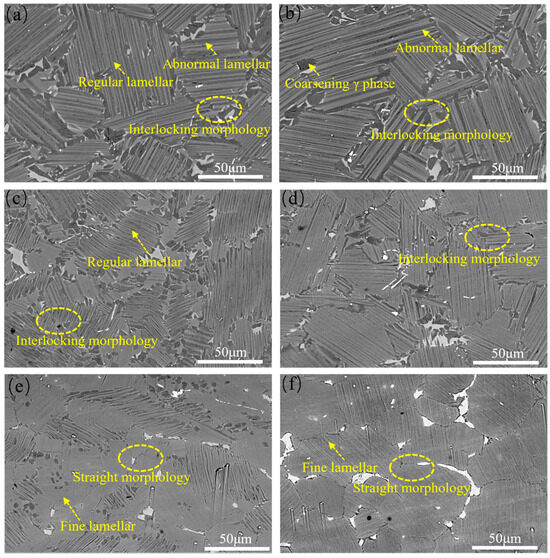 The microstructures of TiAl alloy heat-treated at different conditions. (a) 1250 °C, 0.1 °C/s; (b) 1280 °C, 0.1 °C/s; (c) 1250 °C, 0.5 °C/s; (d) 1280 °C, 0.5 °C/s; (e) 1250 °C, 2.5 °C/s; (f) 1280 °C,2.5 °C/s.