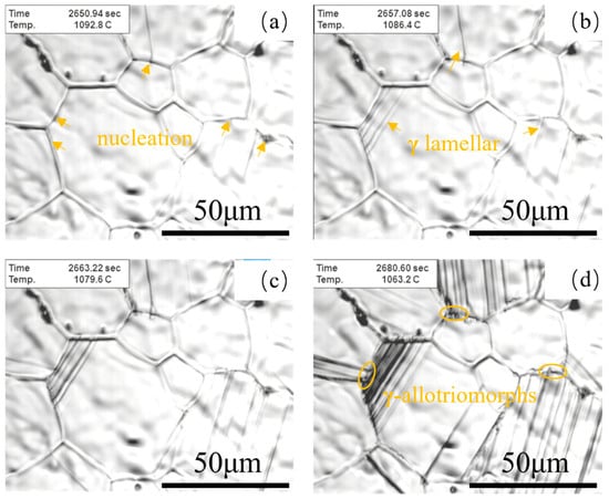 Figure 6 shows the in situ observation images of microstructural evolution in TiAl alloy during slow cooling. Samples underwent a pre-treatment cycle: heating to 1280 °C, followed by 10 min of isothermal holding (to ensure complete phase transformation), then constant-rate cooling at 1 °C/s. The in situ observations during the slow cooling of the TiAl alloy revealed that γ lamellar structures nucleated and grew at grain boundaries, forming γ allotriomorphic structures at their tips. Li et al. [23] established a direct correlation between colony boundary formation and γ allotriomorphic development: following γ phase precipitation at grain boundaries, γ lamellae grow into α grains on one side of the grain boundary, whereas γ allotriomorphic structures form in the α grain regions adjacent to the grain boundary on the opposite side.