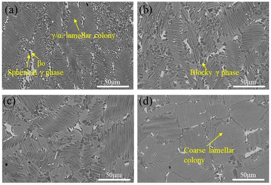 The microstructures of TiAl alloy heat-treated at different temperatures with a cooling rate of 0.5 °C/s. (a) 1150 °C; (b) 1220 °C; (c) 1250 °C; (d) 1280 °C.