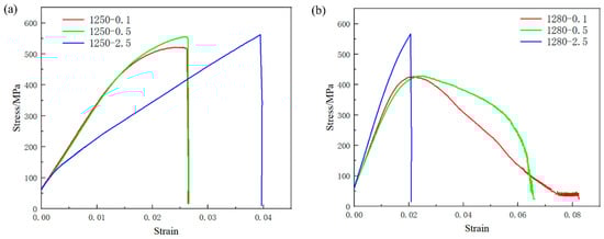 High-temperature tensile stress–strain curves at different heat treatment temperatures. (a) 1250 °C; (b) 1280 °C.
