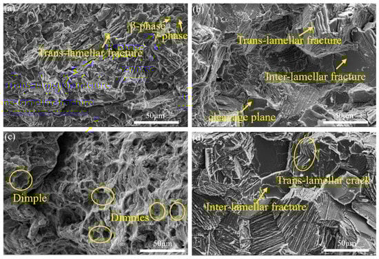 Figure 9 presents the fracture morphologies of specimens subjected to different heat treatment processes. Figure 9a exhibits small smooth facets characteristic of γ grain cleavage fracture alongside flat trans-granular brittle fracture planes in the βo phase. In contrast, Figure 9b,d display extensive cleavage planes accompanied by prominent interlamellar and trans-lamellar fractures, all indicative of predominantly brittle fracture behavior. Notably, Figure 9c reveals dimpled fracture surfaces with significant plastic deformation features.