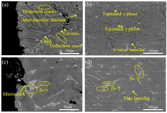 As shown in Figure 10c,d, specimens heat-treated at 1280–2.5 °C/s exhibit significantly increased βo phase content near and far from the fracture surfaces, with extensive βo phase accumulations and βo/γ mixed microstructures surrounding lamellar colonies. During tensile deformation at 800 °C, incoherent deformation between γ and βo phases initiates crack nucleation. Subsequent crack propagation preferentially follows lamellar colony boundaries, culminating in rapid fracture. Notably, compared to Figure 10a,c, it shows fewer distributed cracks, indicating reduced damage tolerance. This microstructural characteristic serves as the primary contributor to brittle fracture.