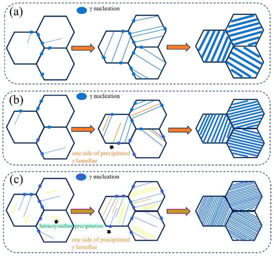 The elevated defect density at grain boundaries facilitates preferential γ phase nucleation along α grain boundaries, as evidenced in Figure 6a. Following nucleation, rapid longitudinal growth of γ lamellae occurs along established lamellar interfaces (Figure 6b). Subsequent cooling promotes γ phase precipitation adjacent to existing lamellae, forming twin-related crystallographic configurations. Crucially, this twinned growth mode requires lower activation energy compared to homogeneous α matrix nucleation, attributable to coherent twin boundaries providing minimal interfacial energy. It was revealed in the experimental study that the elevated cooling rate substantially augmented both the population density of γ lamellae precipitates and their growth kinetics along the longitudinal direction. This microstructural evolution induced localized stress accumulation within adjacent matrix domains, thereby facilitating the direct precipitation of fresh γ-lamellae near pre-existing ones. Upon reaching a critical cooling rate of 120 °C/min, the adjacent precipitation mechanism became predominant [23]. Notably, under such rapid cooling conditions, the initial precipitation stage exhibited dual characteristics: (i) conventional nucleation along α phase boundaries, and (ii) a substantial volume fraction of intragranular γ lamellae precipitates.