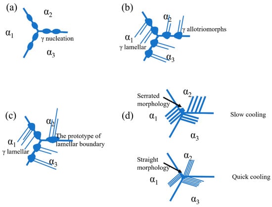 Schematic diagram of lamellar boundary morphology formation. (a) γ nucleation; (b) The formation of γ allotriomorphs; (c) The prototype of lamellar boundary; (d) Grain boundary morphology at different cooling rates.