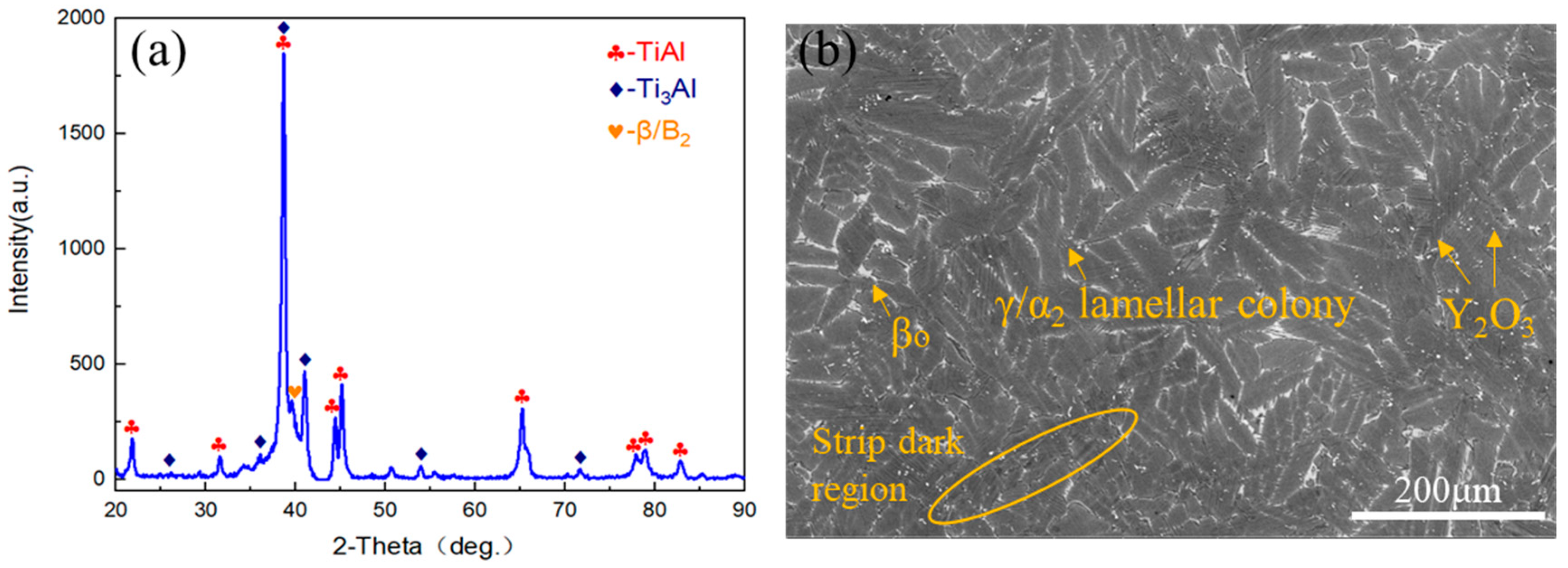 - Yue, H.; Yang, J.; Miao, K.; Yao, Y.; Fan, G.; Zhang, F.; Liu, P.; Wu, H.; Wang, Y.; Li, R. Simultaneously enhanced tensile strength and ductility of nano-Y2O3-reinforced TiAl alloy prepared by directed energy deposition. Mater. Charact. 2024, 207, 113472. [Google Scholar] [CrossRef]