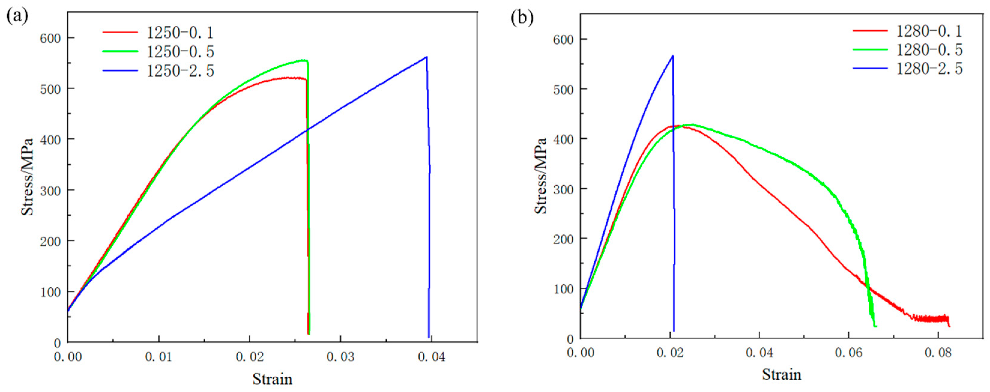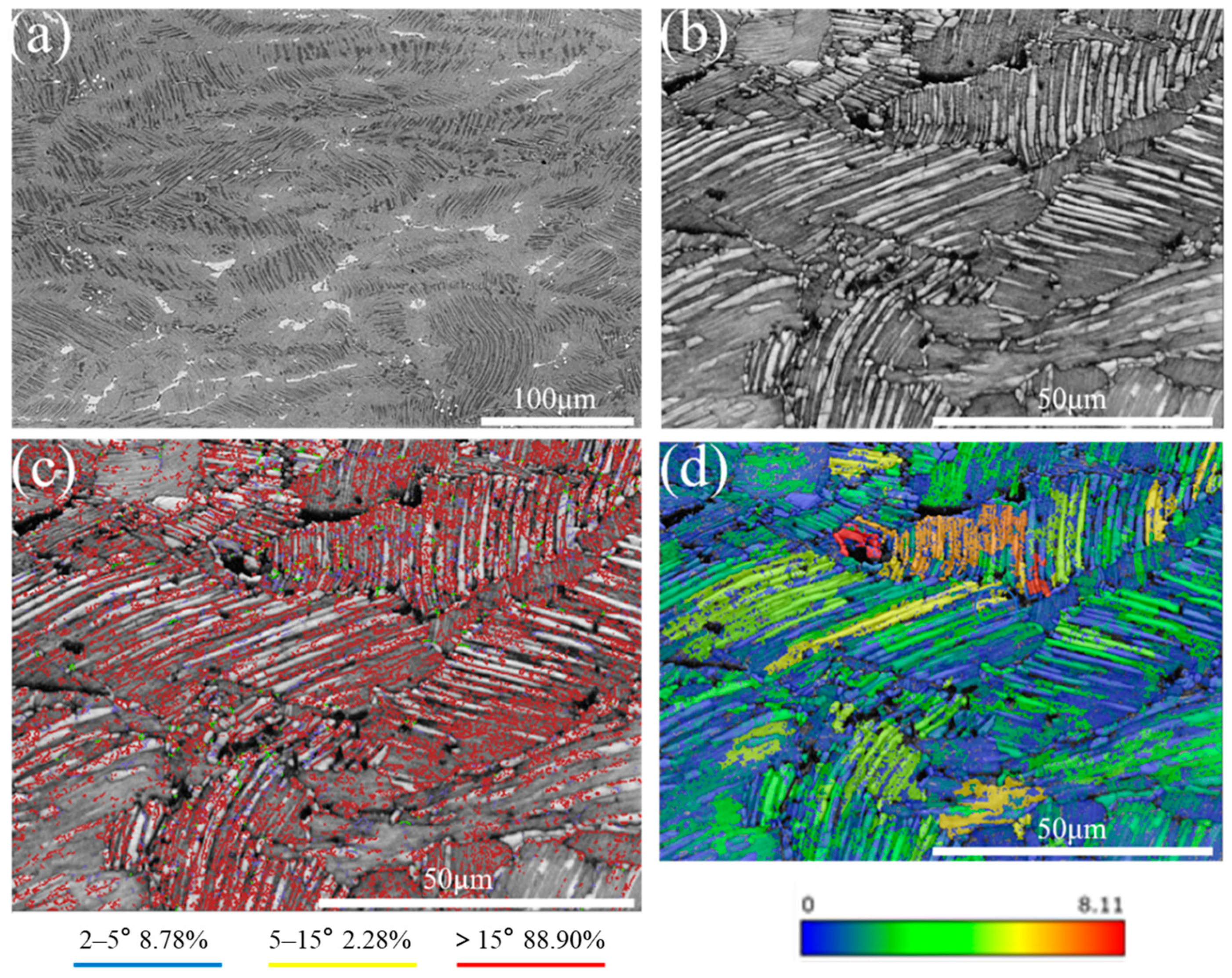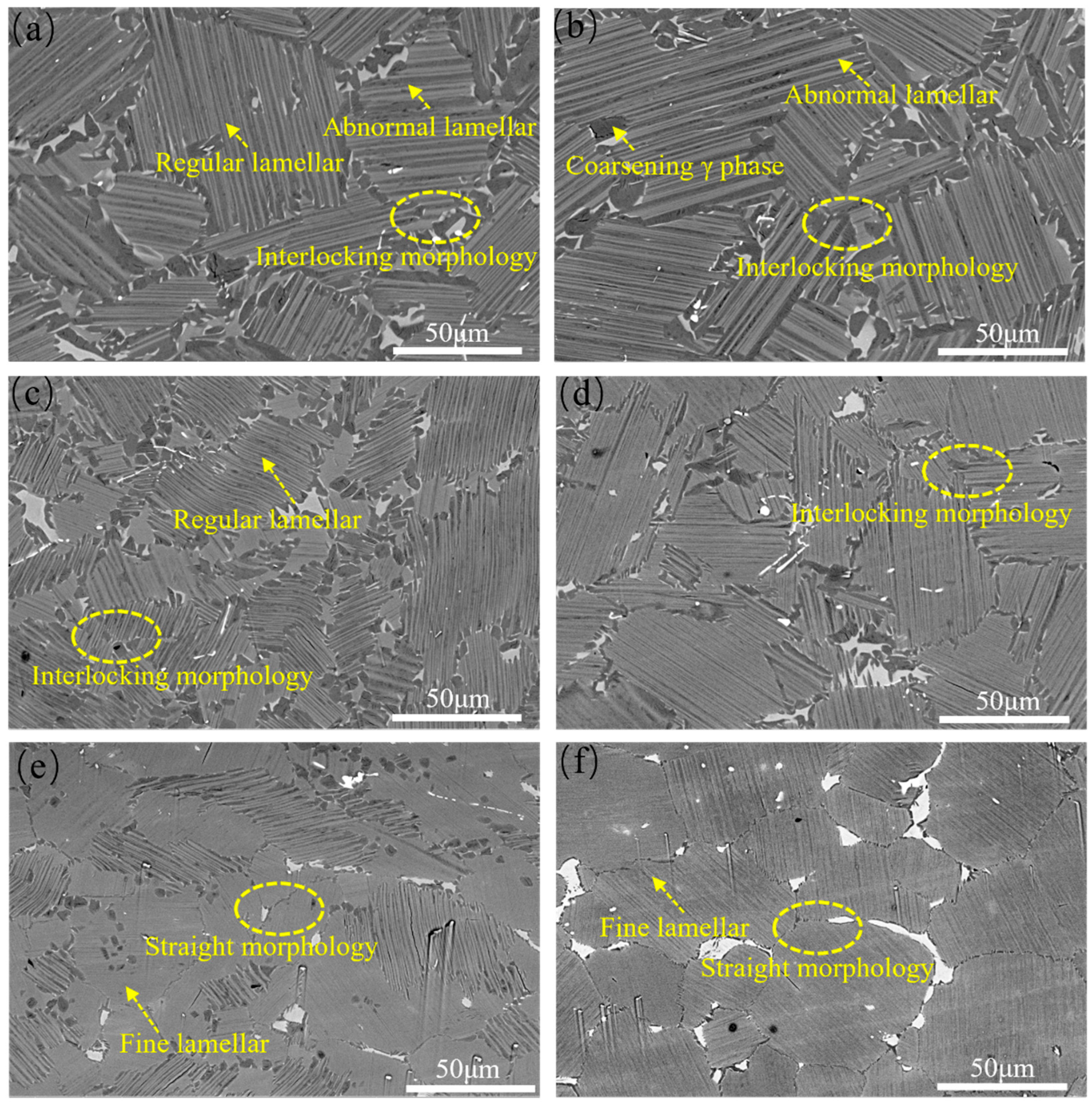 - Fine lamellar colony sizes and interlamellar spacing effectively enhance tensile strength, where the relationship between tensile strength and interlamellar spacing is most critical: the smaller the interlamellar spacing, the higher the tensile strength. Brittle βo and γ phases are prone to incoherent deformation, leading to rapid crack nucleation and propagation; thus, brittle βo phases should be eliminated. Zigzag interlocking lamellar boundaries and uniformly distributed equiaxed γ grains inhibit crack propagation and improve plasticity.