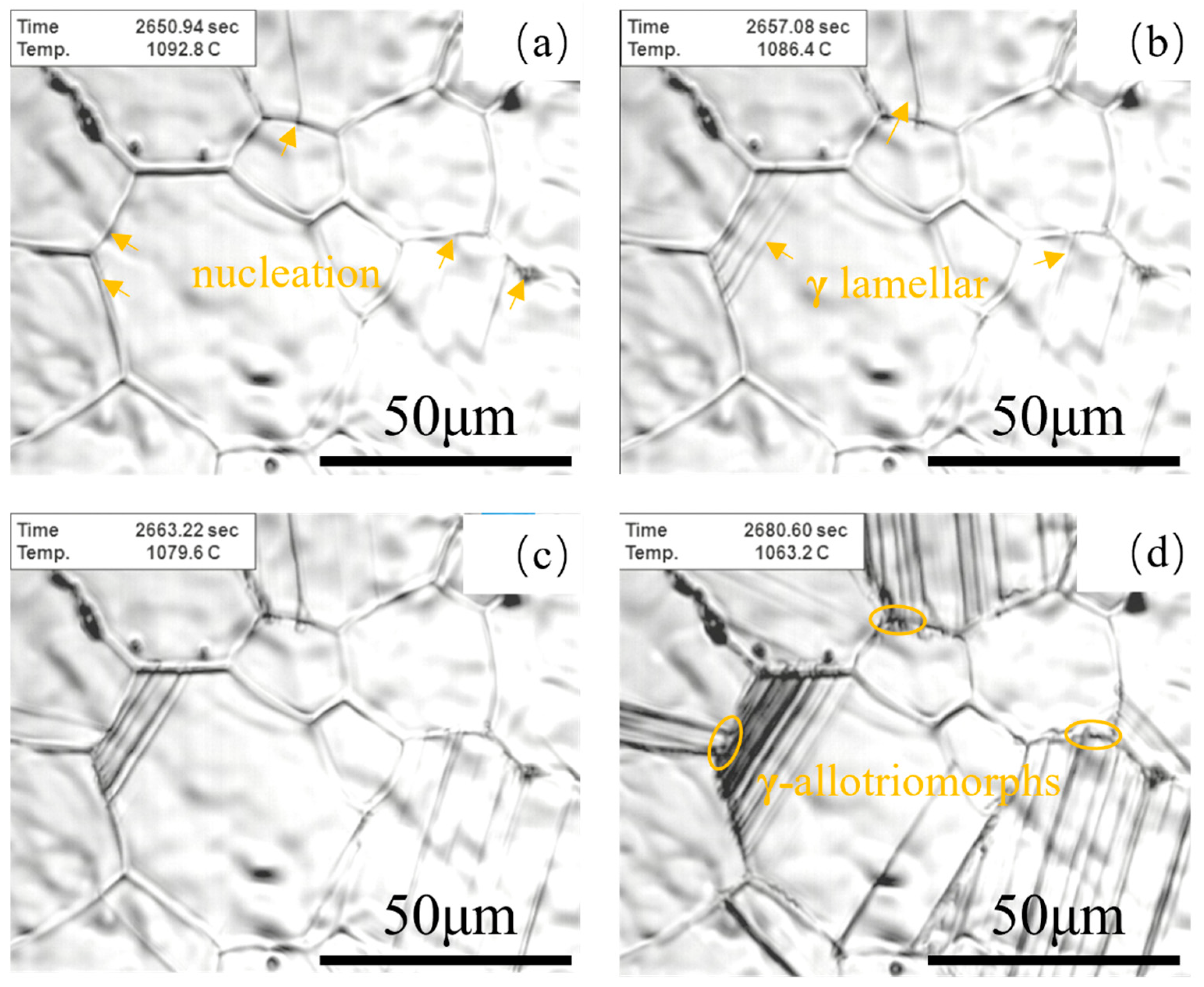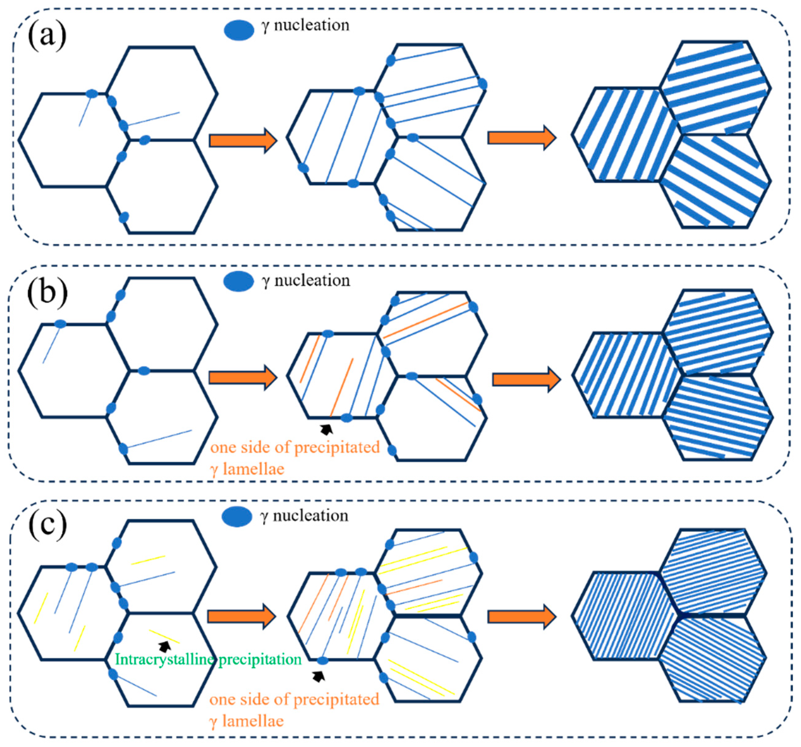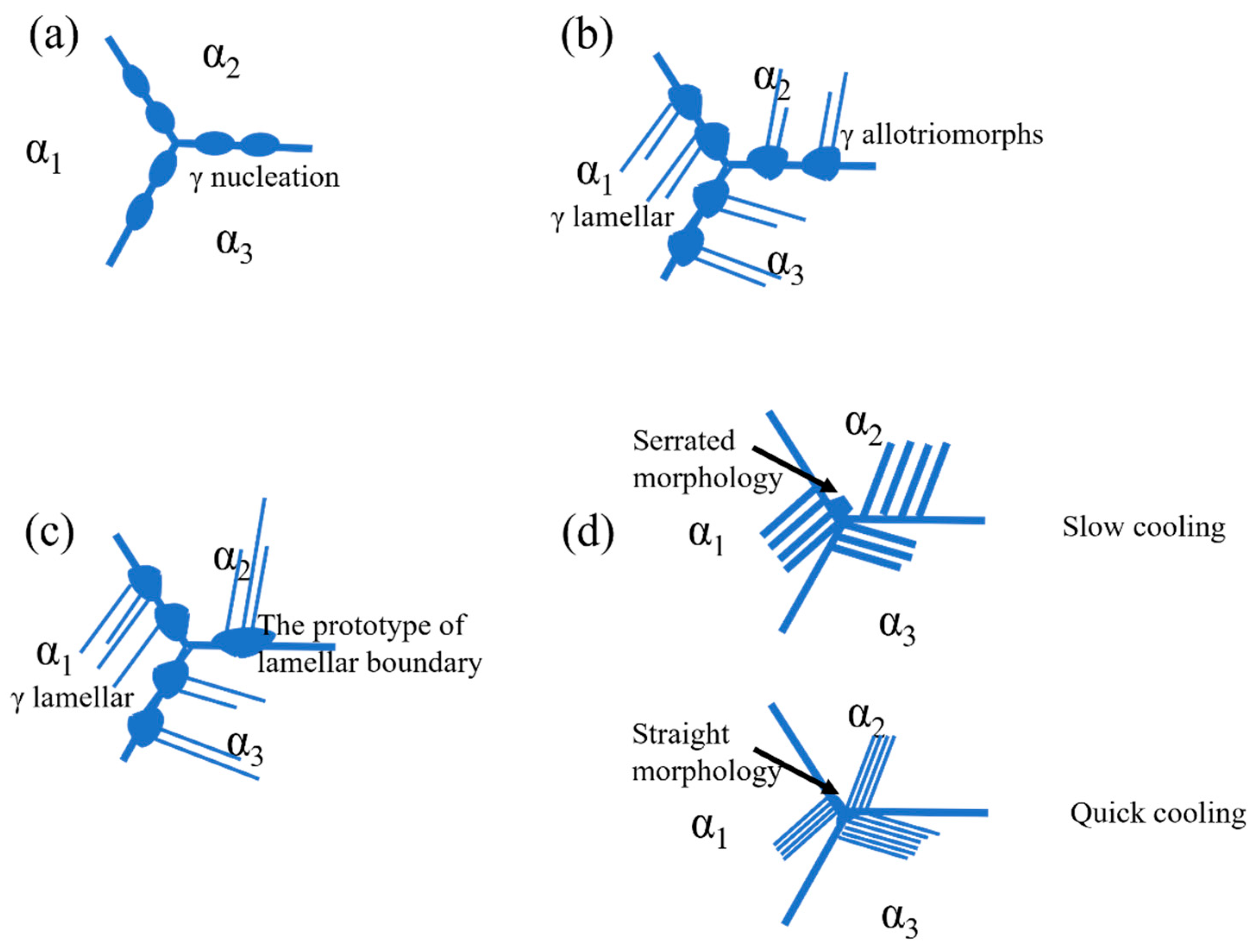 - Cooling rate is a critical factor influencing lamellar colonies; higher cooling rates result in finer interlamellar spacing. Additionally, the precipitation behavior of γ lamellae is closely tied to the cooling rate. At extremely low cooling rates (0.1 °C/s), γ lamellae nucleate and grow exclusively at α grain boundaries. As the cooling rate increases, γ phase nucleates not only at α grain boundaries but also on the sides of pre-existing γ lamellae. At faster cooling rates, such as 2.5 °C/s, homogeneous nucleation of γ phase occurs within the lamellae. The morphology of lamellar colony boundaries is also strongly dependent on the cooling rate. At slow cooling rates, γ allotriomorphs merge and grow near grain boundaries, forming a zigzag interlocking morphology. When the cooling rate increases, γ allotriomorph growth is suppressed, and the colony boundaries transition from a zigzag interlocking to a smooth, straight morphology.