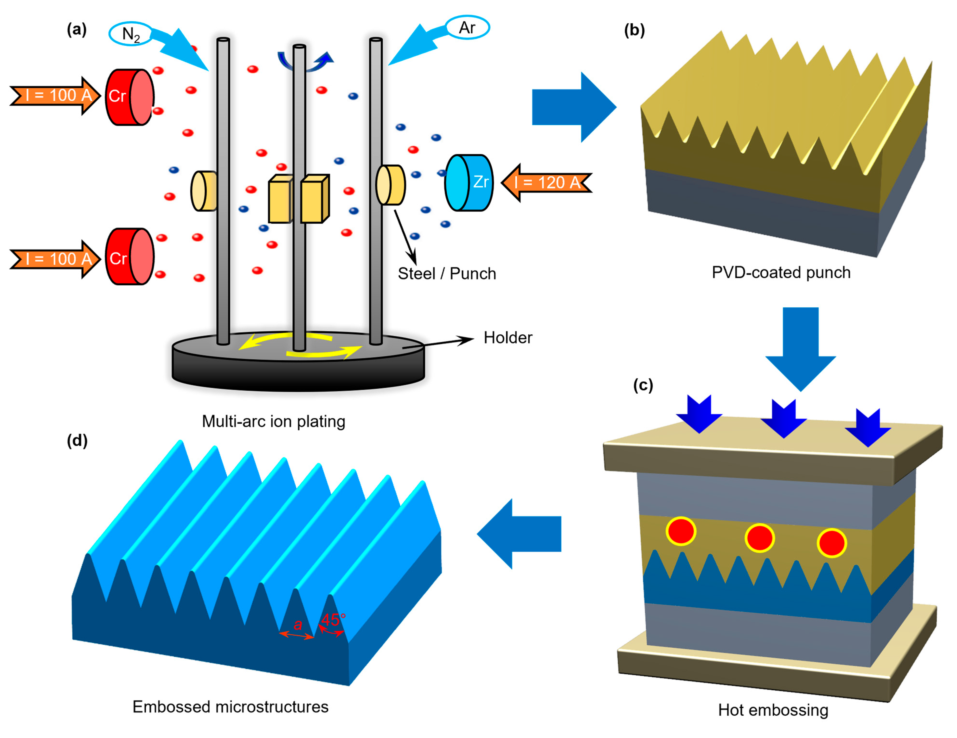 (a) Multi-arc ion plating and (b) the obtained PVD-coated punch. (c) Hot embossing and (d) the embossed microstructures.