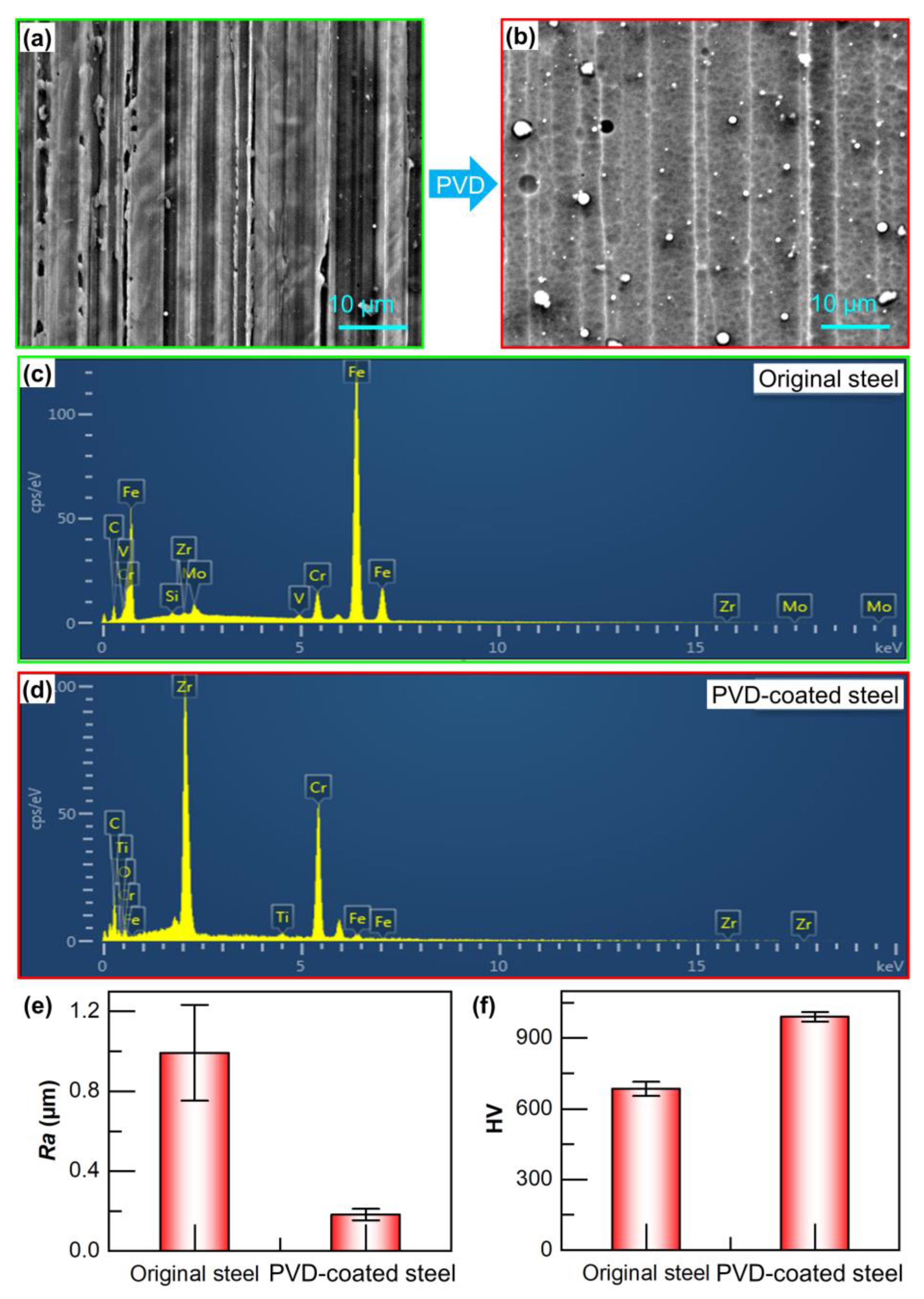 SEM images of (a) original and (b) PVD-coated steel; EDS spectrum of (c) original and (d) PVD-coated steel; (e) surface roughness and (f) hardness before and after multi-arc ion plating.