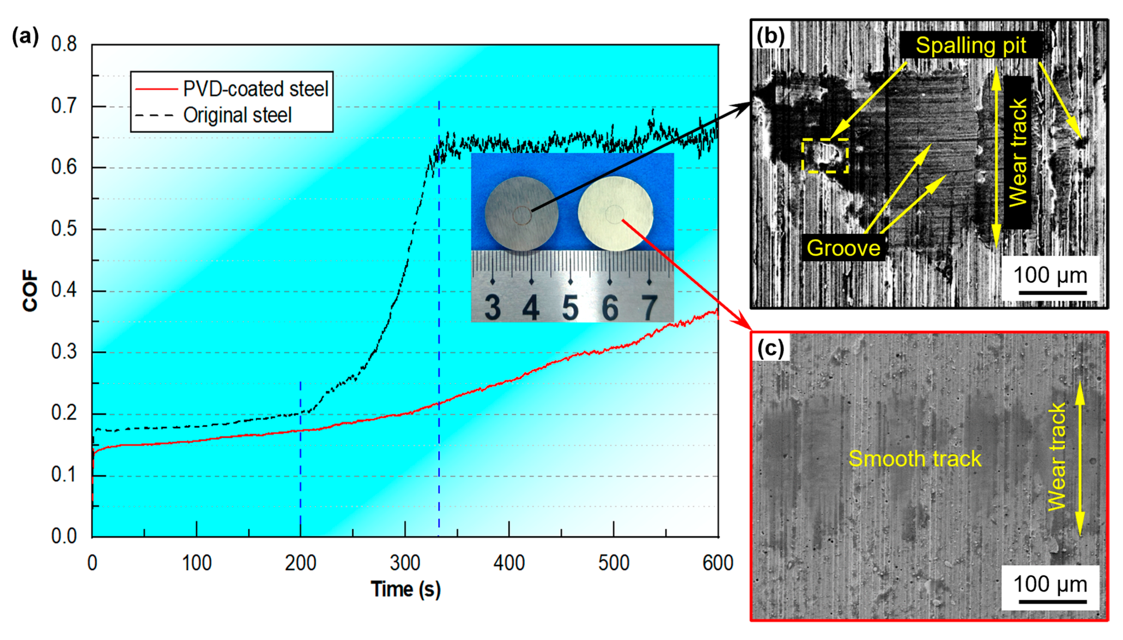(a) Friction coefficient curves before and after multi-arc ion plating. SEM morphologies of the (b) original and (c) PVD-coated steel after wear.