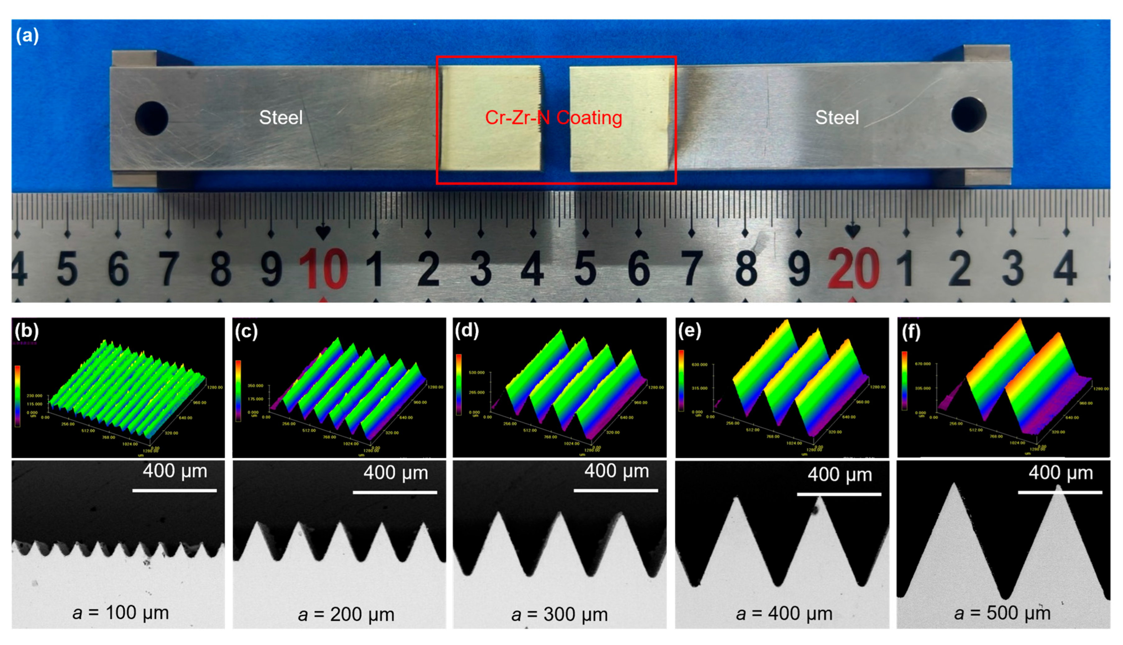 (a) Microstructured punches after multi-arc ion plating. Three-dimensional profiles and SEM of PVD-coated punches with micro-channel side lengths of (b) 100 µm, (c) 200 µm, (d) 300 µm, (e) 400 µm, and (f) 500 µm.
