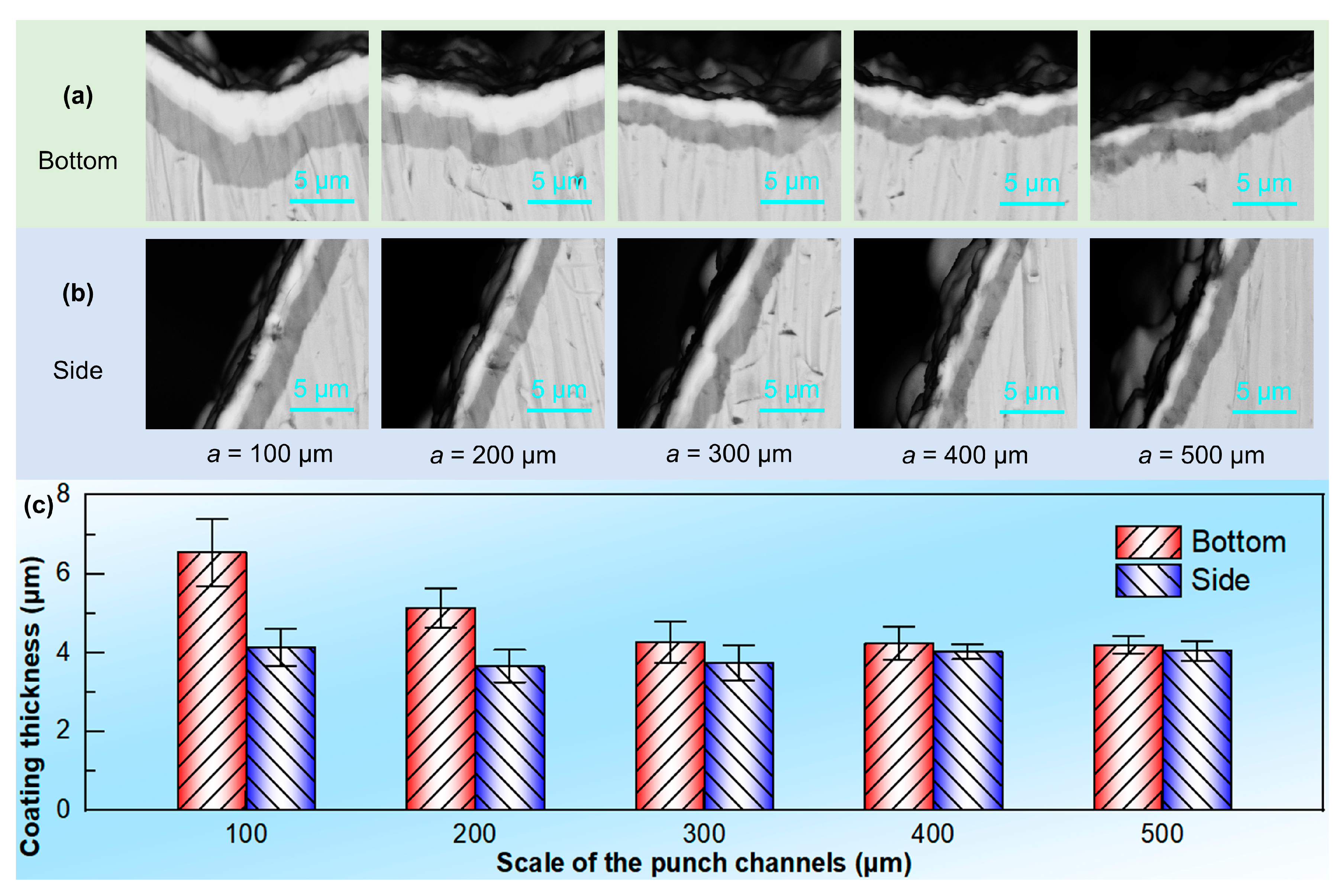 Figure 6 shows the distribution of the coating thickness on the bottom and sides of the micro-channels in each punch in Figure 5. The coating thickness of the microstructured punch after multi-arc ion plating is between 4.5 ± 2 µm, and there is a certain relationship between the coating thickness and the scale of the microstructures. As shown in Figure 6a,b, the coating thickness at the bottom gradually becomes thinner as the size of the micro-channels increase, whereas the coating thickness on the side changes little with the increase in the micro-channel size. Moreover, as the size of the micro-channels increases, the coating thickness on the surface of the punch becomes more uniform. Figure 6c describes the variation in the coating thickness on the bottom surface and the side surface of the microstructured punch. Generally speaking, after multi-arc ion plating, the coating thickness on the bottom surface of the micro-channels is greater than that on the side surface, but the difference in coating thickness gradually decreases as the size of the micro-channels increases. Specifically, when a = 100 µm, the coating thickness on the bottom surface of the micro-channels is approximately 6.5 µm, whereas the coating thickness on the side surface is approximately 4.1 µm. When a = 500 µm, the coating thickness on the bottom surface and the side surface of the microchannels is basically the same (the bottom surface of 4.2 µm, and the side surface of 4.0 µm). This is mainly because during the deposition process of the multi-arc ion-plating target material, it tends to accumulate in the pits at the bottom of the micro-array channels, resulting in a thicker coating on the bottom surface than the side surface. The smaller the micro-channel size, the more densely the micro-channels are arranged, and the higher the proportion of the pits at the bottom. The target material is more likely to deposit at the bottom, leading to a thicker coating at the bottom of the smaller sized micro-channels. Nevertheless, on these microstructured punches with the size of several hundred micrometers, the coating thickness is maintained between 4.5 µm ± 2 µm, accounting for a very small proportion, and its influence on the embossing of the micro-array channels could almost be ignored.