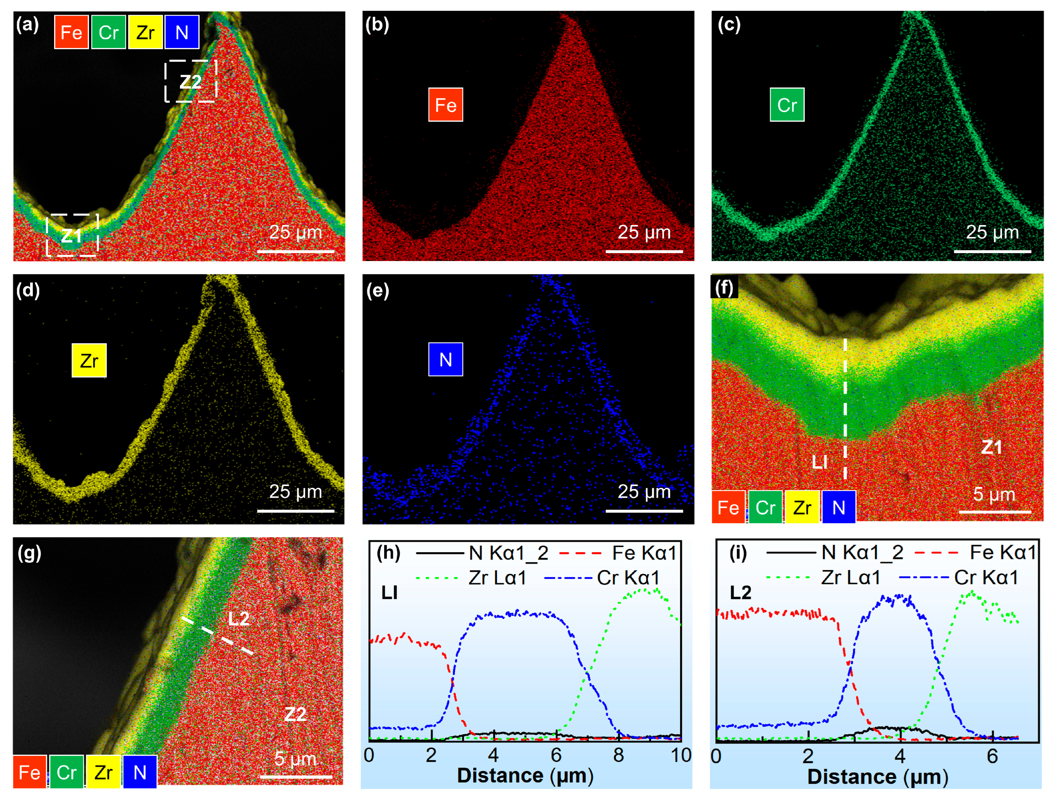 (a) EDS results of the cross-section on the microstructured punch. Distribution of (b) Fe, (c) Cr, (d) Zr, and (e) N elements. Element distribution of the (f) bottom Z1 and (g) side Z2 of the micro-channel punch. EDS results on (h) bottom line L1 and (i) side line L2.