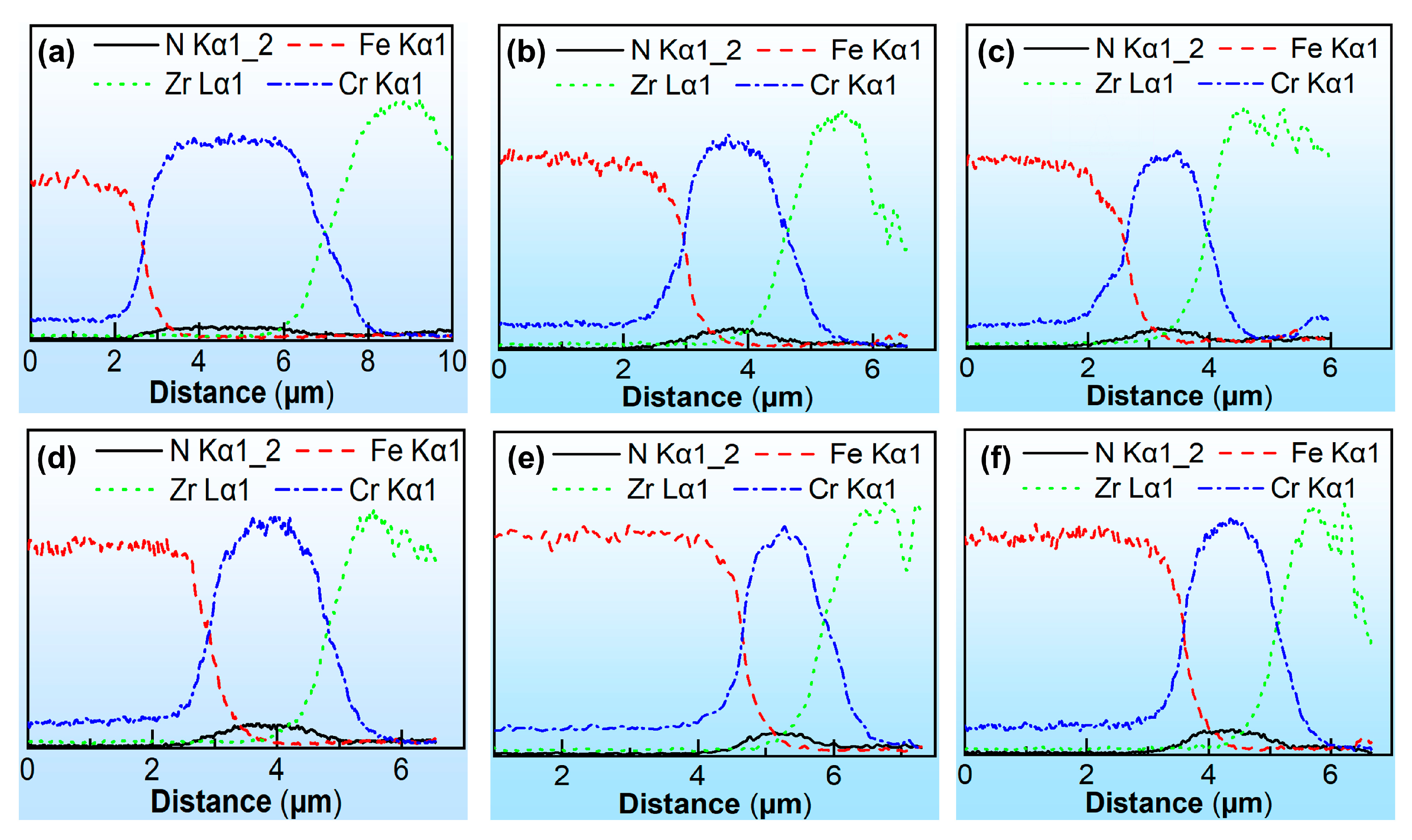 EDS line scanning results on the bottom surface of micro-channel punches with side lengths of (a) 100 µm, (b) 300 µm, and (c) 500 µm. EDS line scanning results on the side surface of micro-channel punches with side lengths of (d) 100 µm, (e) 300 µm, and (f) 500 µm.