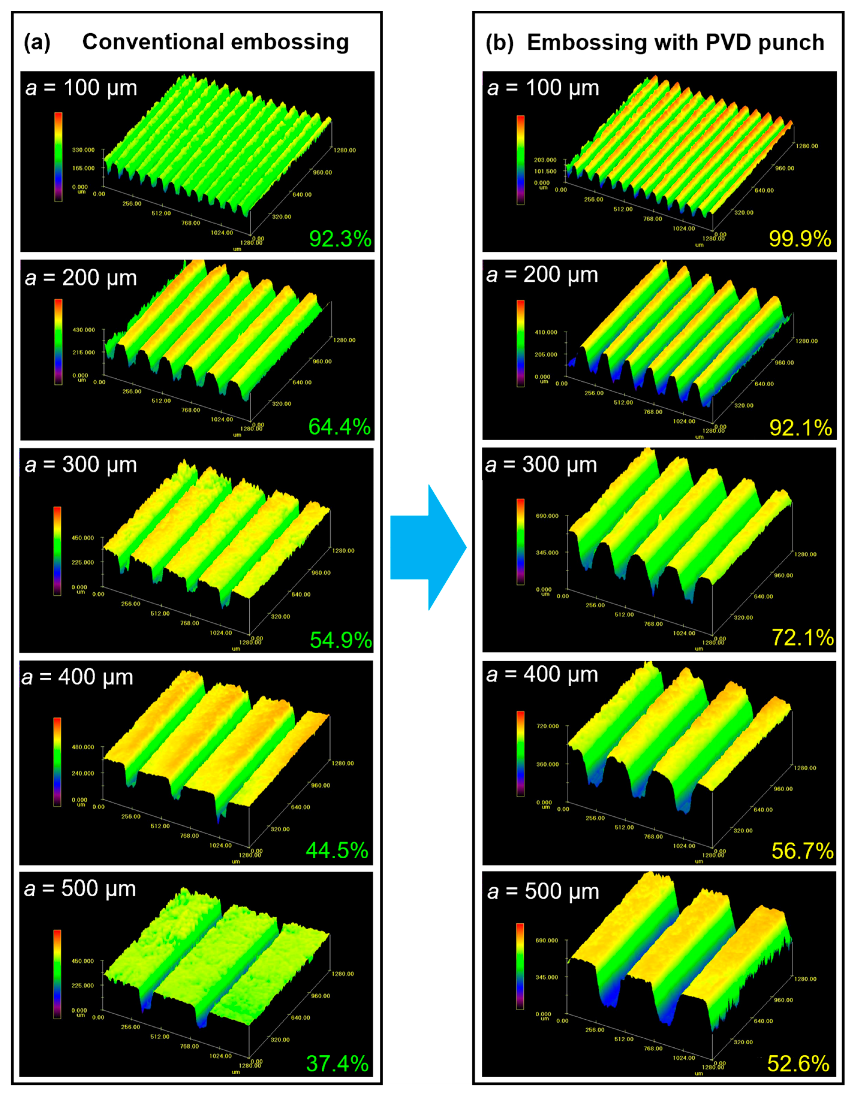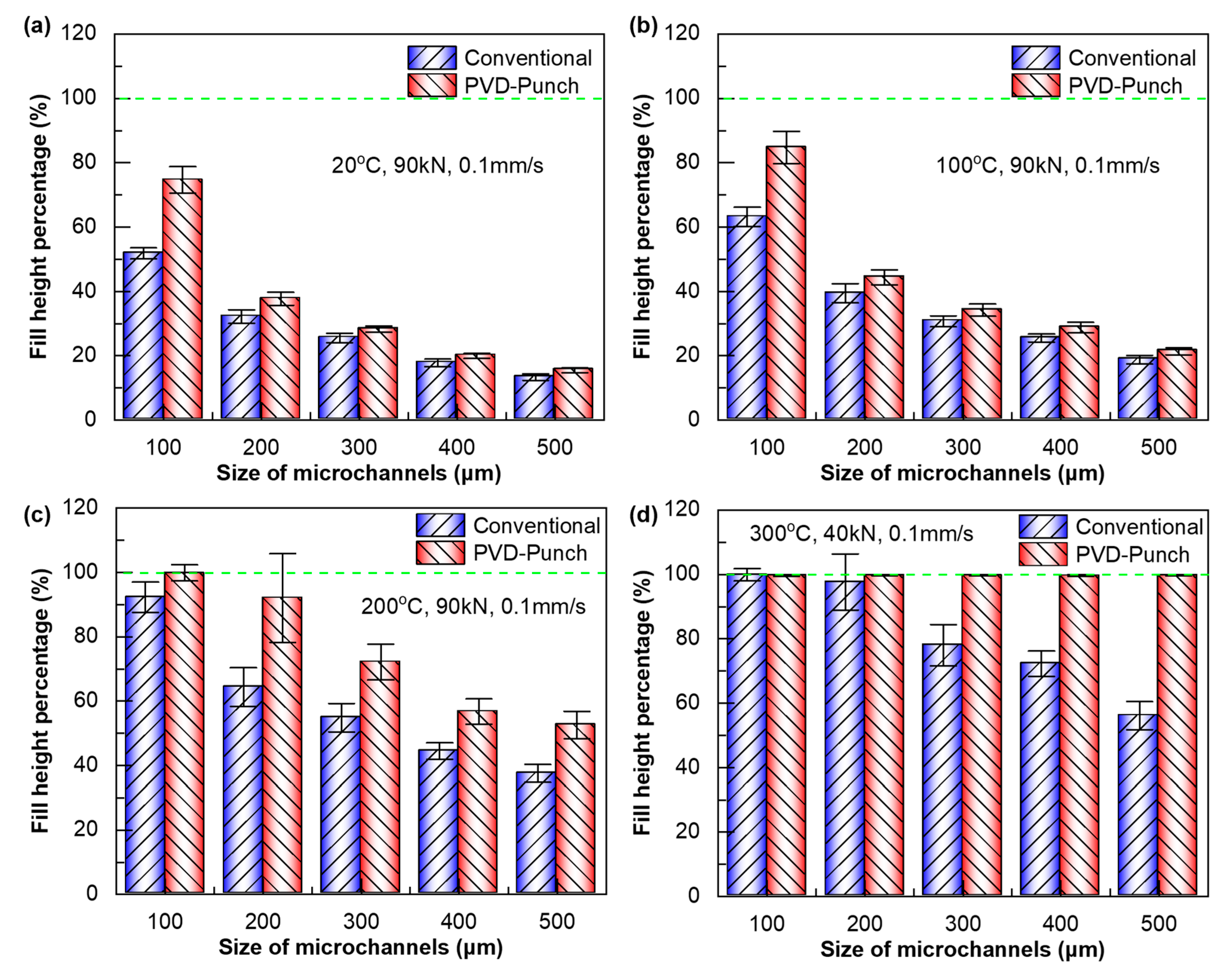 To demonstrate the advantages of using multi-arc ion-plating punch to improve the hot embossing formation of micro-array structures, a process comparison was conducted between conventional embossing using uncoated punch and PVD-coated punch-assisted embossing. Figure 9 shows the filling performance of micro-array channels obtained by hot embossing using these two processes. Fill height percentage is used to characterize filling performance, and when the fill height percentage reaches 100%, it indicates that the micro-array channels are fully formed. It is found that under the same embossing parameters, whether in room temperature embossing or hot embossing, the filling performance of the PVD-coated punch-assisted embossing is better than that of conventional embossing. As shown in Figure 9a,b, when TE = 20 °C and 100 °C, and FE = 90 kN, the micro-array channels of all sizes cannot be fully formed, that is, the fill height percentage is less than 100%. The fill height percentage of the PVD-coated punch-assisted embossing is higher than that of conventional embossing. When a = 100 µm, the fill height percentage of the PVD-coated punch-assisted embossing is 21.5% to 22.8% higher than that of conventional embossing. Under the same embossing parameters and at relatively lower temperatures, the fill height percentage of the micro-channels with larger sizes is lower. This is mainly because the deformation amount when micro-channels with larger sizes are fully formed is greater, and they need to undergo more intense plastic deformation and work hardening [33,34]. While the side length of micro-channels increases to 500 µm, the fill height percentage of the PVD-coated punch-assisted embossing is 2.2% to 2.6% higher than conventional embossing.