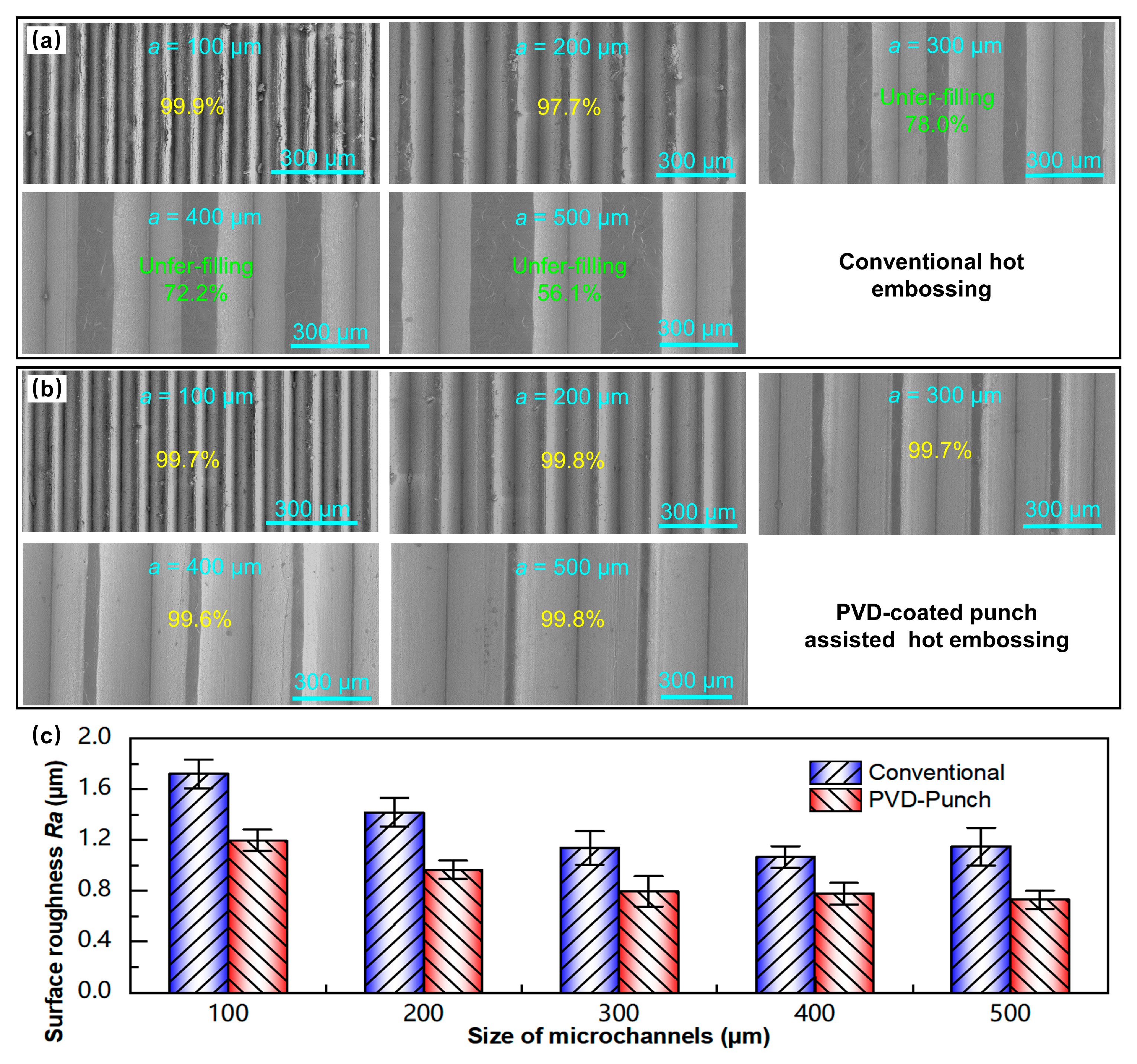 When the embossing temperature reaches 300 °C, due to the occurrence of dynamic recovery and recrystallization of the aluminum alloy, the material softens severely [35,36]. Although the embossing force is only 40 kN (50 kN lower than that at 200 °C), the filling performance of the aluminum alloy during embossing is significantly improved, and the fill height percentage is also higher, as shown in Figure 9d. Figure 11a,b, respectively, show the SEM morphologies of the micro-array channels fabricated by the two processes under the conditions of 300 °C and 40 kN. For conventional hot embossing, when a = 100 µm and 200 µm, the micro-array channels can be completely filled. As it increases to 300 µm, the micro-channels cannot be fully formed, exhibiting under-filling defects. However, all the micro-array channels of various sizes fabricated by the PVD-coated punch-assisted embossing could achieve complete filling, and the fill height percentage is close to 100%. When a = 500 µm, the fill height percentage of the micro-array channels fabricated by PVD-coated punch-assisted embossing is as high as 99.8%, whereas the conventional hot embossing specimen is only 56.1%. At the same time, the average surface roughness of the micro-array channels formed at 300 °C is compared, and the results are shown in Figure 11c. It is found that the surface of the micro-array channels fabricated by PVD-coated punch-assisted embossing is smoother, and the average surface roughness is lower than conventional embossing. For the micro-array channels fabricated by conventional hot embossing, the average surface roughness Ra ranges from 1.066 to 1.719 µm. Meanwhile, for the specimens fabricated by the PVD-coated punch-assisted embossing, Ra ranges from 0.730 to 1.197 µm, and the roughness is reduced by 27.2% to 36.4%. The wear resistance of the punch with multi-arc ion plating is increased, and its surface is smoother than the punch without coating, as described in Figure 3 and Figure 4; during the embossing and demolding processes, the frictional resistance between the punch and the material is smaller, which is beneficial for the filling of the microstructured punch cavities and the acquisition of a smoother surface quality.