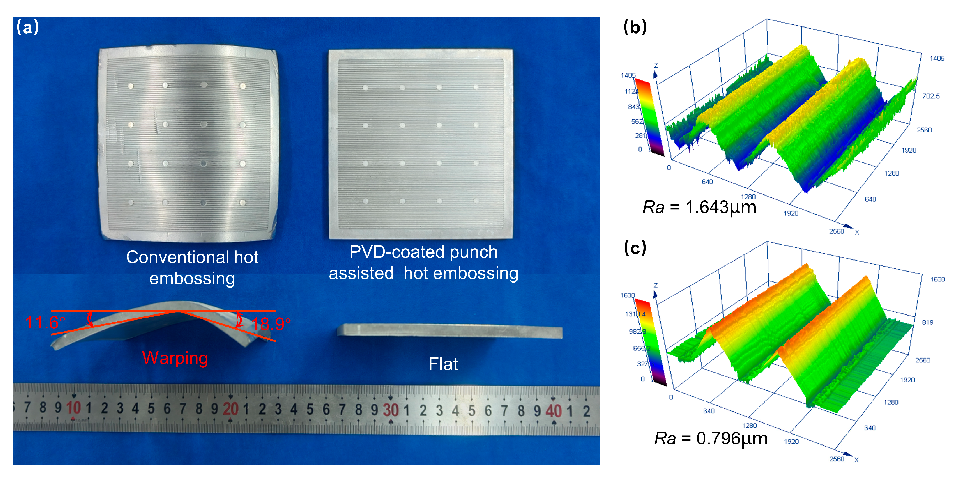 To verify the superiority of PVD-coated punch-assisted embossing in large-area trans-scale formation, two processes were used to fabricate large-area micro-array channels with an outer shape size of 100 cm2, as shown in Figure 12. It is found that the large-area micro-array channels fabricated by conventional hot embossing suffer severe warping deformation after demolding, whereas the large-area specimen fabricated by PVD-coated punch-assisted embossing is flat, as depicted in Figure 12a. The warping deformation is mainly caused by the excessive friction between the punch and the material during the demolding process [37,38]. The PVD-coated punch after multi-arc ion plating is smoother and has less friction, enabling the warp-free hot embossing formation of large-area micro-array structures. Figure 12b,c show the 3D profiles of the micro-array channels formed by the two processes, respectively. It is found that the large-area micro-channels fabricated by both processes are very full, but the micro-channels fabricated by PVD-coated punch-assisted embossing are smoother, with an average surface roughness Ra of 0.796 µm, which is 51.6% lower than that of conventional hot embossing. Using multi-arc ion plating to coat the surface of the punch with a Cr-Zr-N coating not only improves the hardness and wear resistance of the punch, but also enhances the filling performance and surface quality of the microstructures fabricated by hot embossing. Moreover, this method could be extended to applications in large-area trans-scale formations.