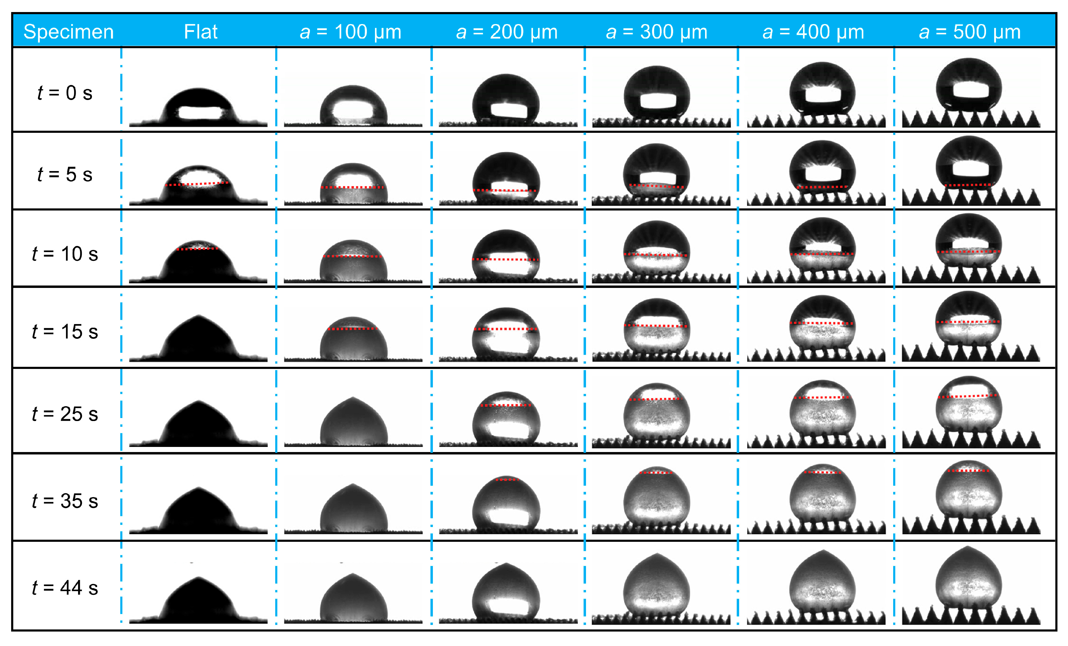 Freezing images of microstructured surfaces at different times: The red dashed line in the figure represents the solid-liquid interface within the droplet. The region above the dashed line is the unfrozen liquid portion, while the region below the dashed line is the frozen solid portion.