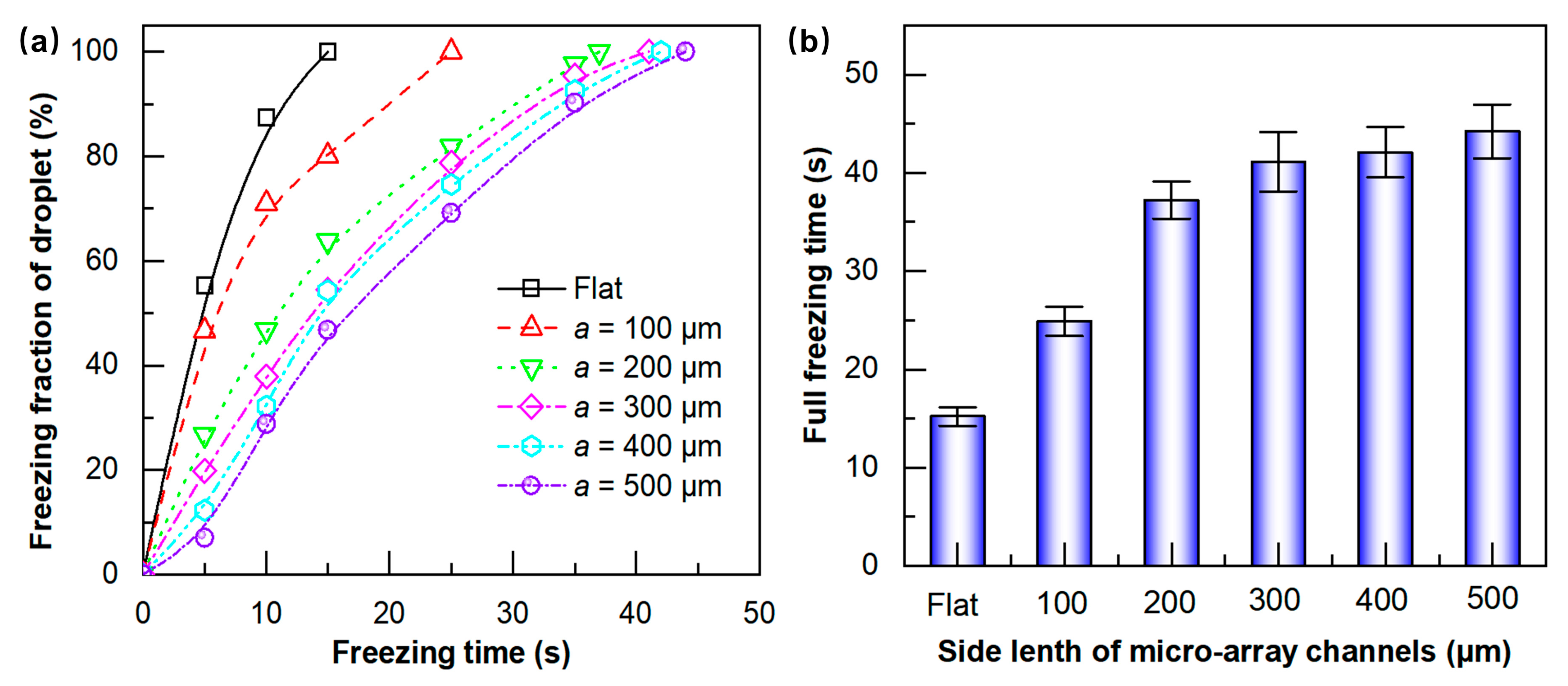 (a) The variation in droplet freezing fraction with freezing time; (b) influence of micro-array channels on the full freezing time.