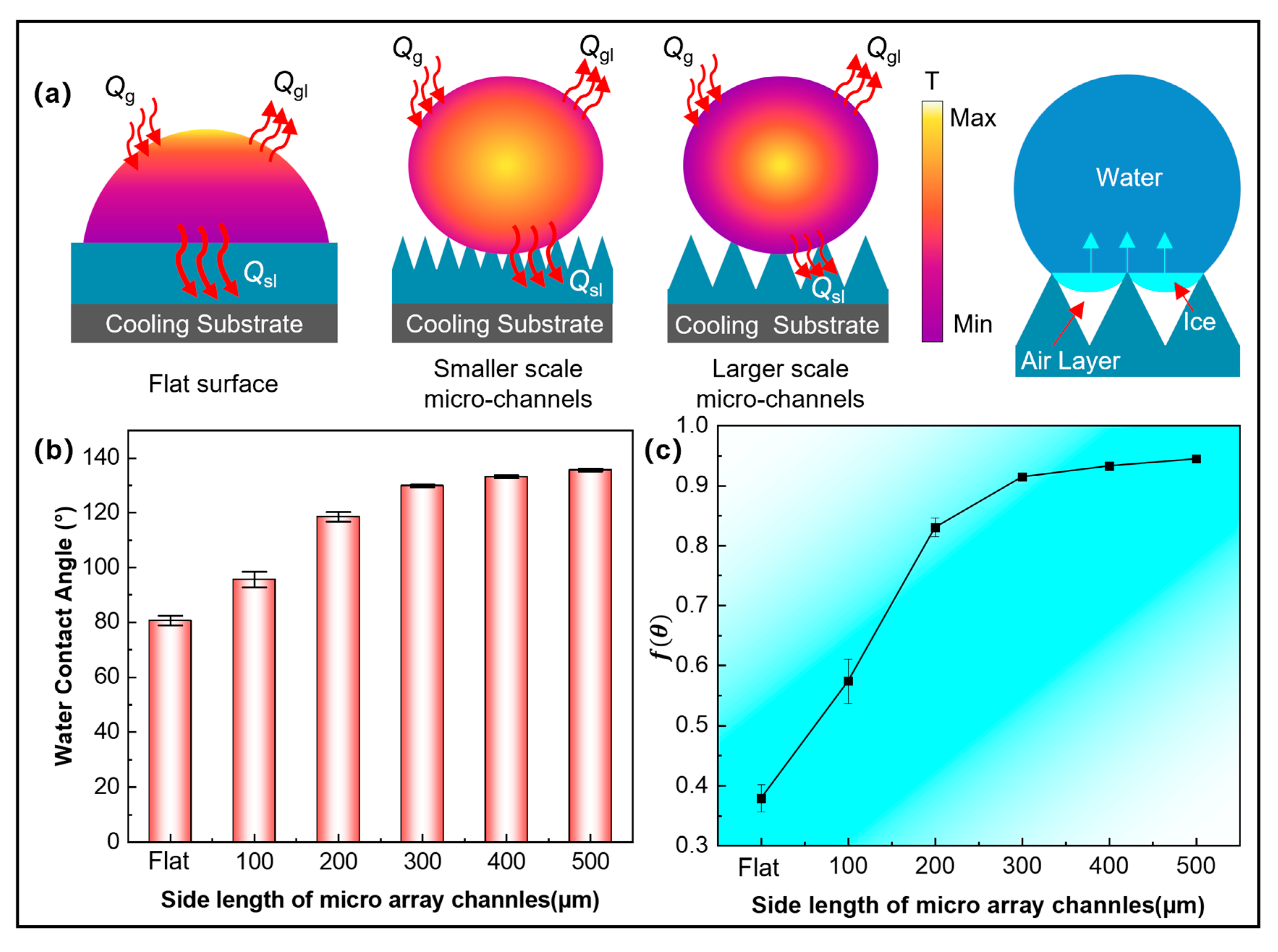 The mechanism of enhancing anti-icing properties on micro-array channels is discussed. Under freezing conditions, the droplet resides on the microstructured surface in the Cassie–Baxter state, with the liquid unable to penetrate into the micro-array channels. Instead, a continuous air layer is entrapped between the droplet and the surface. This air layer effectively prevents liquid infiltration into the grooves of the microstructure, thereby increasing thermal resistance at the liquid–solid interface. As a result, the conductive heat transfer pathway between the droplet and the substrate is shortened, reducing the overall heat dissipation from the droplet and delaying its internal cooling, as illustrated in Figure 15a. The process could be quantitatively described by the following equation: