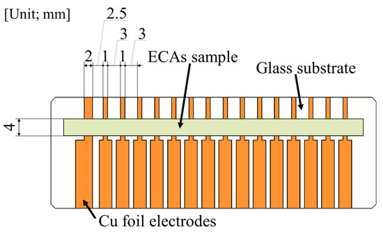 The method for estimating the interfacial electrical resistivity between the ECAs and Cu electrodes is described in Section 2.5. A supplemental explanation of the experimental procedure is added here. The electrical resistance of the samples was measured using a Kelvin probe for the four-electrode measurement by changing electrode spacing, as shown in Figure A2. The measuring data can analyze the relationship between the electrical resistance and the electrode spacing by fitting Equation (1), indicated in Section 2.5, as shown in Figure A3. The interfacial electrical resistivity can be estimated using the intercept with the electrical resistance axis.