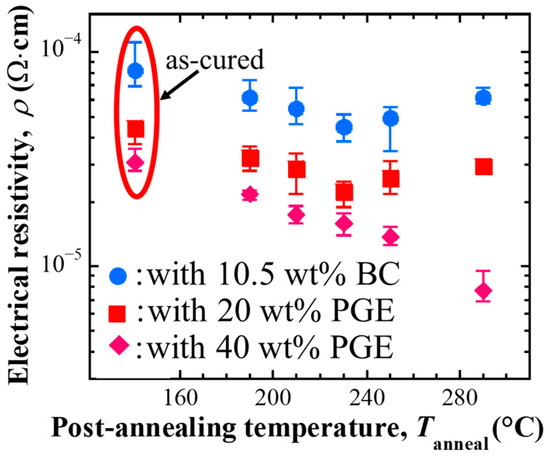 Regarding the electrical resistivity after post-annealing, all samples decreased compared to that after curing. When post-annealing was performed at each condition below 230 °C, the electrical resistivity tended to decrease as the post-annealing temperature increased. However, the BC-added sample and the sample with 20 wt% PGE showed a change in electrical resistivity that increased again above 250 °C. For the sample with 40 wt% PGE, the electrical resistivity decreased as a function of post-annealing temperature, and resistivity in the range of 10−6 Ω·cm was obtained after post-annealing at 290 °C.
