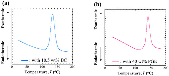 Result of DSC measurement for (a) ECA sample with 10.5 wt% BC and (b) ECA sample with 40 wt% PGE during heating from ambient temperature to 200 °C.