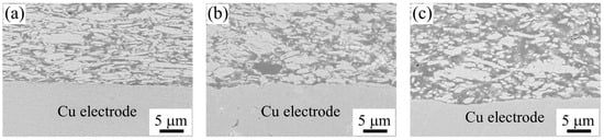 Figure 9a,b show the SEM images of the cross-sectional microstructure near the bonding interface with the rolled Cu electrode for the BC-added sample and the PGE 40 wt% main agent substitution sample, which were post-annealed at 290 °C. Comparing the interface microstructure with the Zn-plated electrolytic Cu electrode shown in Section 3.2.3, the sintering structure of the adhesive layer was found to differ depending on the binder chemistry, as with the electrolytic Cu electrode sample. However, when focusing on the interface between the electrode and the adhesive, it was confirmed that the surface of the electrode did not change much in any of the samples after curing. As described in Section 3.2.3, for the BC-added samples, the microstructure of the interface with the Zn-plated electrolytic Cu electrode changed significantly due to the post-annealing; the microstructure of the interface to the rolled Cu electrode did not change in terms of the unevenness of the electrode surface after post-annealing at 290 °C compared to after curing. From this observation, it can be thought that the increase in the unevenness of the electrode surface in the BC-added sample for the Zn-plated electrolytic Cu electrode is due to the mass transfer between the electrode and the conductive adhesive sample via the Zn plating.