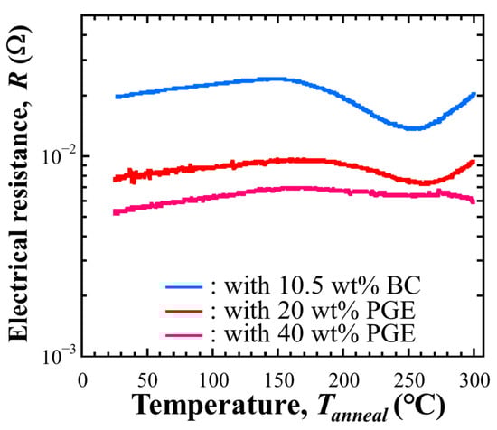 The changes in electrical resistance during annealing were measured for each conductive adhesive. Figure 6 shows the changes in electrical resistance when the samples were heated up to 300 °C after curing. For all composition samples, the electrical resistance increased to the curing temperature of 150 °C, and a decrease in electrical resistance was observed at temperatures above 150 °C. As the annealing temperature increased, the electrical resistance of the BC-added sample increased from about 255 °C, and that of the 20 wt% PGE-added sample increased again from about 265 °C. The electrical resistance did not increase again for the 40 wt% PGE-added main component sample and showed a gradual decrease.