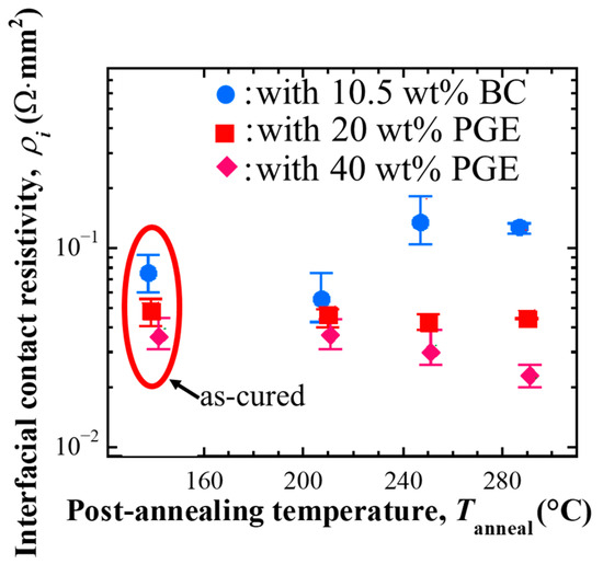 Next, the interfacial electrical resistivity after post-annealing was evaluated. The sample had no significant change with 20 wt% PGE added depending on the post-annealing temperature. This change differed from the electrical resistivity inside the sample, which tended to increase with post-annealing at 250 °C or higher. For the sample with 40 wt% PGE, the interfacial electrical resistivity tended to decrease as the post-annealing temperature increased, in the same way as the electrical resistivity. On the other hand, for the BC-added samples, the interfacial electrical resistivity decreased after the post-annealing at 210 °C, but it increased significantly when the post-annealing was performed at 250 °C or higher.