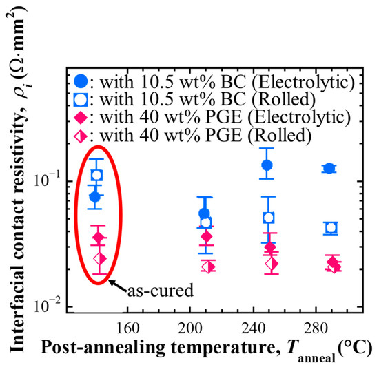 For the Zn-plated electrolytic Cu electrode samples, the BC-added samples showed a significant increase when post-annealed at 250 °C or higher, but for the rolled Cu electrode samples, there was no increase, and the value decreased depending on the post-annealing temperature. In addition, the PGE-added samples showed lower values than the Zn-plated electrolytic Cu electrode samples at all post-annealing temperatures. Still, there was no decrease in the value after curing. This indicates that the interfacial electrical resistivity was sufficiently reduced by curing.