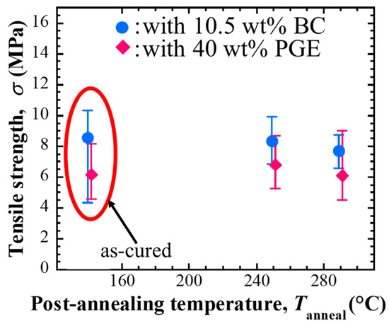 The mechanical connection properties of each ECA sample to the Cu electrode were evaluated based on the bonding strength of adhesive butt-jointed adhesive samples. Figure 10 shows the adhesive strength of the BC-added sample and the sample with 40 wt% PGE added after curing and post-annealing. As a result, the adhesive strength after curing was 6–9 MPa, and the strength was maintained without significant decrease after post-annealing at 250 and 290 °C. Compared to the samples with non-reactive diluents, those with reactive diluents tended to have lower bonding strength. However, the main fracture mode of the samples with non-reactive diluents was interfacial failure, whereas the samples with reactive diluents showed cohesive failure, suggesting that the adhesiveness of the bonding interface is affected by the added diluents. This difference in the adhesiveness of the bonding interface may also affect the interfacial electrical resistivity mentioned above.