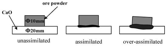 In the assimilability experiment, the ore powder and alkali metal compounds were mixed thoroughly by a ball mill (MSK-SFM-12M, Kejing Star Technology Co., Ltd., Shenzhen, China). Then, 1.0 g of the mixture and 2.5 g CaO reagent (≥98.0%, Damao, Tianjin, China) were compressed under a pressure of 20 MPa for 3 min into cylindrical compacts of 10 mm and 20 mm in diameter, respectively. After the compacts were dried, the iron ore compact was put up on the CaO compact and then put into the micro-sintering equipment, which is shown in Figure 2a. The compacts were first heated to 1000 °C and then heated at 3 °C/s until the assimilated state was observed. During the heating process, 1 L/min N2 (99.99%) was continuously injected into the equipment and the assimilation states of iron ore at different temperatures were observed by a high-definition camera. The assimilation process of iron ore is shown in Figure 3, and the temperature at which the interface between the iron ore compact and CaO compact started to melt was recorded as the lowest assimilation temperature (LAT). The assimilability of iron ore was characterized by LAT.