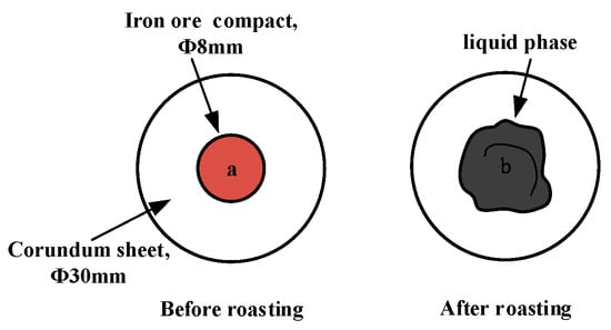 In the liquid-phase fluidity experiment, the ore powder and alkali metal compounds were configured into a mixture with a basicity (CaO/SiO2) of 4.0 by the CaO reagent. A 0.8 g amount of mixture was compressed under a pressure of 20 MPa for 3 min into the cylindrical compact with a size of Φ8 × 5 mm. After drying, the iron ore compact was placed upon a corundum plate 30 mm in diameter and 1.5 mm in height and then put into the micro-sintering equipment. The experimental conditions are shown in Figure 2b, and the sintering temperature was set at 1280 °C. During the roasting process, 1 L/min N2 (heating and holding stage) and 0.5 L/min O2 (cooling stage) were continuously injected into the equipment. After the temperature dropped to room temperature, the corundum plate was taken out to calculate the index of liquid-phase fluidity (ILF). The liquid-phase flow process and calculation of the ILF are shown in Figure 4 and Equation (1), respectively; a and b refer to the vertical projected areas of iron ore compact and liquid phase. The liquid-phase fluidity of iron ore was characterized by the ILF.