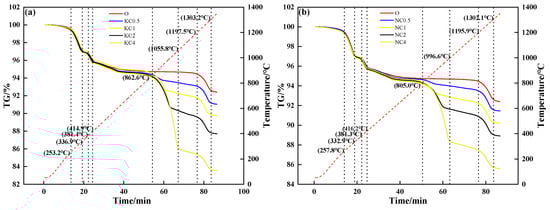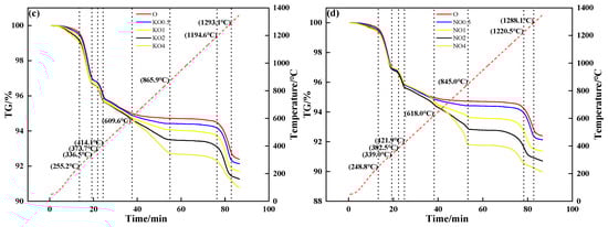 Figure 5 shows the TG curves of mixtures containing different contents and forms of alkali metal compounds. During the heating process, the mixture without alkali metal compounds in different forms had three mass loss stages: The first mass loss stage was 250 °C to 340 °C, which corresponded to the decomposition and volatilization of crystalline water. The second mass loss stage was 370 °C to 420 °C, which corresponded to the decomposition of Fe(OH). The third mass loss stage was 1200 °C to 1300 °C, which corresponded to the decomposition of Fe2O3. After the addition of alkali metal compounds, the fourth mass loss stage was 800 °C to 1060 °C (KCl, NaCl) and 600 °C to 870 °C (K2CO3, Na2CO3), which corresponded to the volatilization of chloride and release of CO2, respectively. When alkali metal content increased from 0 to 4%, Figure 5a and Figure 5b show that the TG curve decreased from 94.67% to 86.04% (KCl) and 88.36% (NaCl), respectively; Figure 5c and Figure 5d show that the TG curve decreased from 94.67% to 92.73% (K2CO3) and 91.81% (Na2CO3), respectively.
