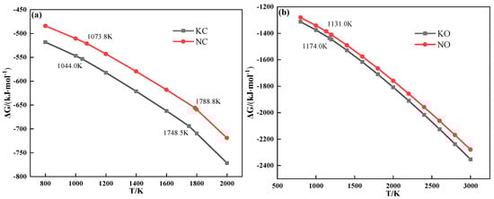 The relationship between Gibbs free energy and temperature of alkali metal chloride (a) and alkali metal carbonate (b).