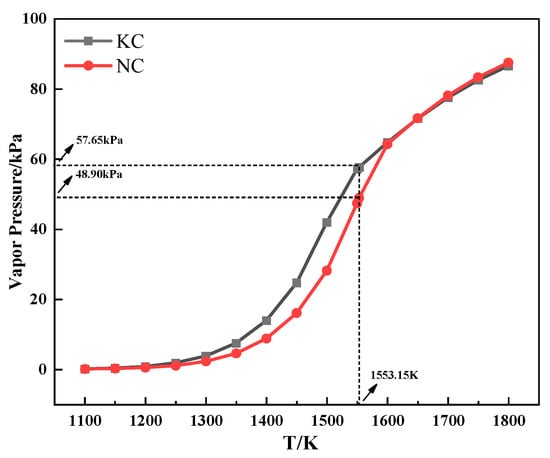 Figure 7 shows the relationship between the saturated vapor pressure and temperature of alkali metal chloride. As can be seen from Figure 7, the saturated vapor pressure of alkali metal chloride increased with increasing temperature. Meanwhile, the saturated vapor pressure of KCl was higher than that of NaCl when the temperature was the same and lower than 1280 °C, which indicated that KCl was more volatile during the heating process. The conclusion explains the discrepancy in the TG experiment that the TG curve of the mixture containing KCl had a larger mass loss from 800 °C to 1060 °C.