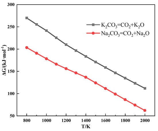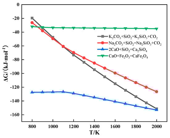 The relationship between the Gibbs free energy and temperature of partial reactions during sintering is shown in Figure 9. It can be seen from Figure 9 that alkali metal carbonate could react with SiO2 to form alkali metal silicate and CO2.