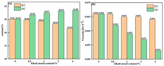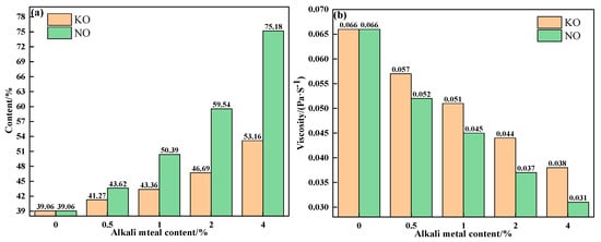 The contents (a) and viscosities (b) of the equilibrium liquid phase at 1280 °C of mixtures containing different contents of alkali metal carbonate.
