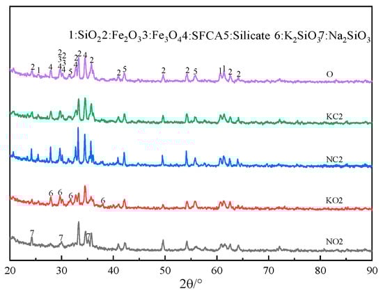 The XRD patterns of sinter after sintering iron ore containing 2% alkali metals are shown in Figure 12. Figure 12 indicates that adding alkali metal carbonate in iron ore resulted in the formation of alkali metal silicate.