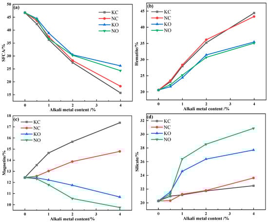 The mineral-phase content variation in sinter after sintering iron ore containing different contents and forms of alkali metals: (a) SFCA; (b) hematite; (c) magnetite; (d) silicate.