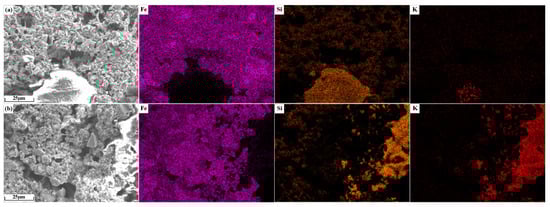 The element distribution of potassium-containing sinter is shown in Figure 15. As shown in Figure 15a, the largest non-overlapping area of Fe and Si elements is the silicate accumulation area, and the K element is concentrated in the center of this area. As shown in Figure 15b, in the region without Fe distribution, K overlaps better with Si, which indicates that the alkali metals in sinter KO2 mainly existed in the form of silicates.
