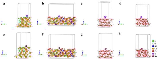 Crystalline surface adsorption models of (a,e) Ca2SiO4 (020); (b,f) SFCA (420); (c,g) Fe2O3 (104) and (d,h) Fe3O4 (220). (a–d): K adsorption, (e–h): Na adsorption.
