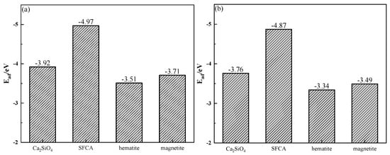 The adsorption energy (Ead) was determined by the crystal energy (Ealkali/crystal) after the adsorption of alkali metal, the crystal surface energy (Ecrystal) before the adsorption of alkali metal, and the atomic energy of alkali metal (Ealkali). The calculation of Ead is shown in Equation (3) [28], and the calculation results are shown in Figure 17. Figure 17 shows that the adsorption of alkali metals on the SFCA crystal surface released energy the most, which meant that the SFCA crystal adsorbing alkali metals was more stable. Therefore, among the iron-bearing minerals, SFCA contained more alkali metal-bearing solid solutions.