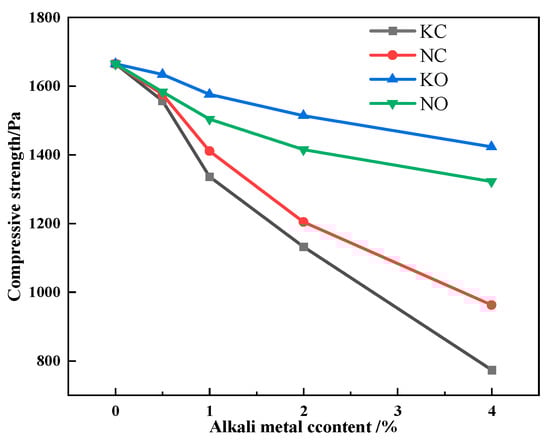 The results of compressive strength detection are shown in Figure 18. Figure 18 shows that the compressive strength of the sinter decreased as the alkali metal content increased, and the compressive strength of the sinter after sintering iron ore containing KCl decreased more significantly.