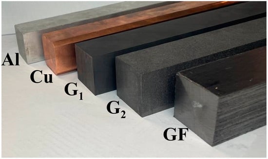 Studies of an aluminum sample (99.999 wt.% Al) in an experimental setup are detailed in our previous work (Figure 2) [41]. In the present work, in addition to the aluminum sample, we also studied samples of pure copper (99.990 wt.% Cu) and of a composite graphite foil-based material (more details thereon will be given in Section 2.2). The geometric dimensions of the samples were 40 × 40 × 300 mm (Figure 1).