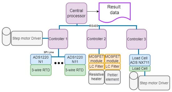 The electronic control unit of the automated system for the measurement of the thermal conductivity of functional and structural products consists of a central processor, auxiliary controllers, high-precision analog-to-digital converters (ADS 1220), three-wire resistance temperature detectors (RTD), MOSFET modules, LC filters, load cells, and stepper motor drivers.