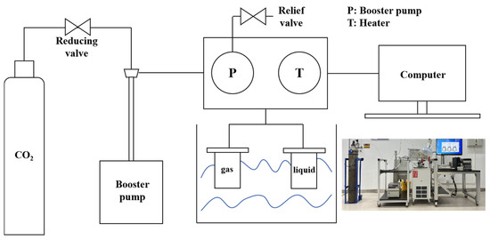 Carbonization test standards were referred to as GB/T 50082-2024 [33]. The prepared standard core samples and standard mechanical property test samples of the four materials were placed in an HTHP reactor. A schematic diagram of the apparatus is shown in Figure 2. The reactor is divided into gas phase and water phase environments. The complete set of HTHP reactor equipment is provided by China National Offshore Oil Corporation (Beijing, China). Ultrapure CO2 is continuously fed into the pipeline of the apparatus to eliminate air; then, the entire apparatus is sealed, and a pressure pump and water bath are used to set the pressure and temperature of the reactor to 10 MPa and 60 °C, respectively. The reactor was enclosed and placed in water to see if it leaked gas. After confirming that the reactor has no leakage, the temperature and pressure are heated and pressurized, and the temperature and pressure are controlled numerically and kept constant to ensure the repeatability of the experimental results. At this temperature and pressure, the CO2 is ultrapure, a critical state. Deionized water is used in the water environment instead of brine because the solubility of CO2 in deionized water is much higher than that of ordinary brine [34] to accelerate the dissolution of CO2. And, this experiment is a static condition, which is also the case in most carbonation experiments. The reason for this is the distance between the abandoned wells and the injection wells, as saturated CO2 brine moves very slowly and negligibly at some distance from the injection wells [35,36]. The reaction was carried out for 28 days under these experimental conditions, and samples were taken at three stages: 7, 14, and 28 days. Attention was paid to the pressure-releasing process, and the pressure-releasing time was kept at about 1 h to avoid sample damage. The carbonized samples were then subjected to mechanical properties, permeability, compositional changes, and micromorphology tests to compare the corrosion resistance of these four materials to supercritical carbon dioxide fluid.