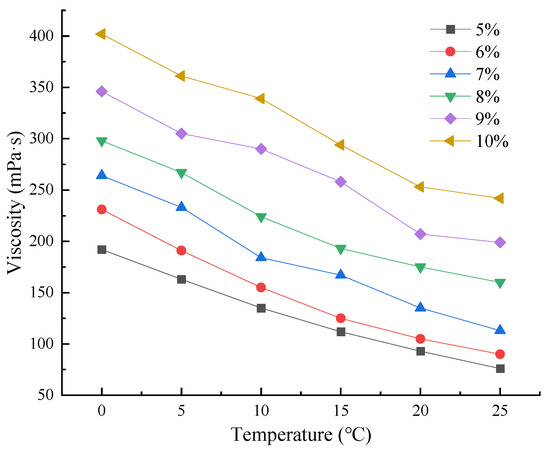 By adding different mass fractions of calcium carbonate powder as an aggravating agent to the plugging agent with a base density of 1.0489 g/mL, a number of groups of plugging agent samples with different densities were designed to study the adjustable range of their densities, which are shown in Table 1. It can be concluded that the experiments successfully adjusted the densities of plugging agents between 1.04 and 1.80 g/cm3. The viscosity range of the plugging agent at 0–25 °C was determined by dissolving 5–10 wt% of SEBS plastic in the plugging agent, as shown in Figure 3, to conclude that the viscosity range of the plugging agent at a conventional surface environment is 76–402 mPa·s, which is within the range of pumpable construction. After the plugging agent enters the formation wellbore, the increase in temperature and pressure will result in a lower liquid viscosity compared to the surface.